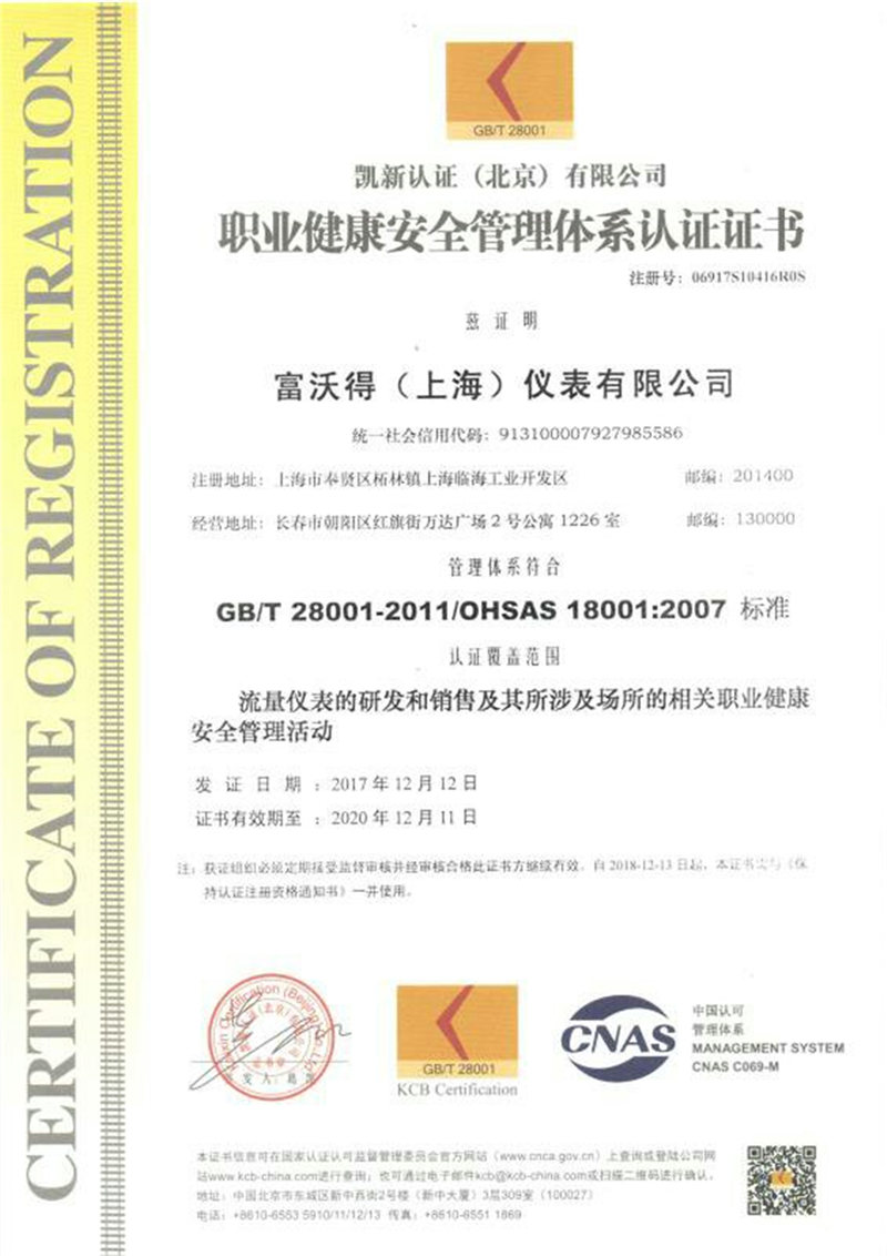 职业健康安全管理体系认证书
